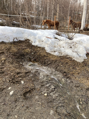 I grabbed a trowel and helped him for a few minutes but only for a few minutes because the horses had to be tended to. They had elected to stand close by and were watching what we were doing. Hrimmi was pawing because this is what she does when she’s hungry.