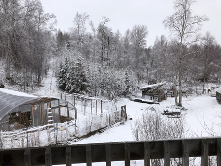 I returned home, driving in the slop, and had a very late breakfast. Pete had made himself sourdough pancake batter and left enough for me. Then it was on to town, to the former banquet room of the historic Eagle Hotel. Business as usual there – Dan (new hire) and Pete unloaded both Pete and my car, this being the macro portion of the unloading process, and then I took care of the micro portion of the same.