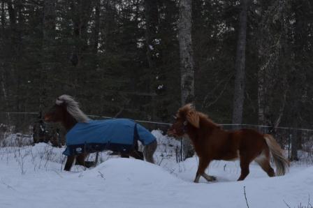 Downhill we went, Raudi barreling along, Pete being pulled along like he was ski-jouring. More horse and human Ice-Capades. We put Raudi in with Hunar – the two long lost buddies immediately greeted one another, by putting their noses together and conferring. Amazingly, they did not take off and race around, but for some time remained deep in conversation.