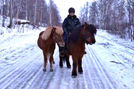 After, come the rest, who when the weather’s good, are ridden. If the road surface is questionable, I walk them. Today I rode Tinni around the loop and ponied Raudi. Riding is different than walking because when riding, I’m more aware of the icy sections. I’m less so when on foot. I then don’t give the matter much thought. If a spot looks questionable, I subconsciously gravitate to another. When on a horse, I have to pay attention and with my body, guide the animal to a safer section. They have four legs rather than two, so I have to anticipate what’s coming up next and guide him or her to a safer section. This is even more challenging with two horses because I also have to make sure that the one being ponied is also on safe ground.
