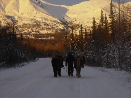 Both horses did extremely well. Icelandic horses have been born and bred to handle adverse trail conditions and cold. At the same time, they are amazingly calm most of the time. I rode Raudi – she followed Signy, and repeatedly avoided the places in which the lead mare punched through the trail. I remember in the past her bolting on portions of the trail. Not today. The thought crossed her mind once when the dogs were running around in the nearby spruce trees. But she thought better of it when I relaxed my seat and loosened up on the reins.