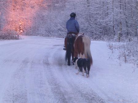 Today we started out with me in the lead. I rode Raudi and ponied Tinni. Pete followed on Signy. And as usual, Hrimmi was here, there, and everywhere. We changed positions later on. Twice I dropped Tinni’s lead when Raudi picked up the pace. And twice Raudi backed up and allowed me to grab it. And twice, Tinni held still while I went to catch him.