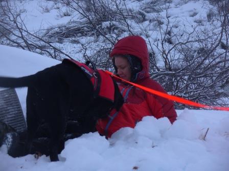 Lastly, Stacey finally got to work with her own dog, Lucas. She had him do two retrievals. Ariel was Lucas’s subject. The snow had not been deep enough for snow cave building, so instead, the subjects were encased in trenches. Aerial laid on an ensolite pad, and another was placed on top of her, as I was told, so that she’d stay warm. Then she was wrapped in a tarp. Beforehand, Donna made sure that she had a radio and an avalanche beacon on her person, and that both were working. The group then covered her in snow. Twice, in very short order, Lucas found and began digging Aerial out of her snowy grave. And both times, the group members imitated those looking for avalanche victims, by tapping their shovels on the ground.