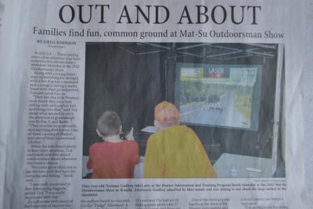 In the March 24, 2014 issue of this newspaper there was an article by Greg Johnson entitled “Out and About: Families find fun, common ground at Mat-Su Outdoorsman Show.” Underneath is a photo of a young boy and perhaps his father or a friend. Nine-year old Norman Godfrey is taking aim at a video set up at the 2013 Outdoorsman Hunter Information and Training booth. There, before him, on the big screen, is a moose crossing the highway. The large male is obviously a trophy specimen – he has a full rack.