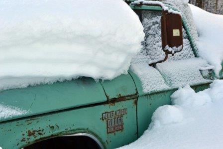Stories beget stories, and steep vehicles in sentiment, making them difficult to sell. Big Red related stories are beginning to accumulate. The other day one of our neighbors, Mike, a kindly but very ineffectual fellow, ran his plow truck, a ’75 Dodge Power Wagon like Fish Habitat, off the road into the deep snow. (This truck is orange red and has sort of black and white cab stripe running lengthwise across its body.) Pete and I were at this point in time heading to town to get a video. (This was an excuse; we just wanted to take Big Red out for a spin.) Well, we went left instead of right because I said that I wanted our neighbors to see us cruising around in Big Red. We of course soon saw Mike, who was standing by his truck. He had a very glum look on his face. Another neighbor, Craig, was getting ready to winch pull Mike’s truck out of the snow, using one of Mike’s other trucks—a new Dodge Power Wagon. (Mike is a hoarder and has many trucks, cars, campers, and buses, few of which work.)