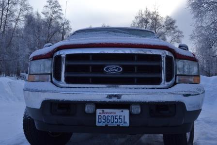 Big Red could easily have done the job at hand. But Big Red did not do this job. This is because Big Red is shiny and new. I mean, this truck gleams. Instead, Pete and I quickly got in Big Red, and Pete backed him out of the range of flying rocks and ice balls.