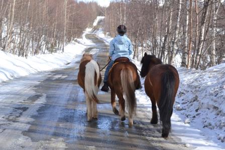| now ponying two horses. Hrimmi was on my left, Signy was on my right, and Raudi was in the middle. Pete followed, and with the crop, tapped Hrimmi on the rear when she lollygagged, and he stroked her on the chest when she barged ahead.