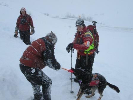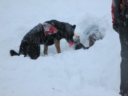 I was in the snow cave for twelve minutes. I heard via the radio that there was some concern about this – this also made me feel more at ease. Shortly thereafter I heard snuffling, saw two paws and a snout. It was Bettles the German shepherd. He began digging. And his owner Vicki began shoveling. Vicki then handed me a tug toy – a rubber ball on a rope – I was told to hang on – and Bettles was told to pull me out. I was rather blown away by how strong Bettles was. I assisted her in wiggling my way out. Then I continued to play with her because as I have now figured out, this is the dog’s reward for having found the subject.