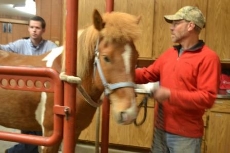 Dr. Witzell began the exam by having us put Lifre in a stock in the clinic. Lifre let it be known that he wanted to be with his buddy Tinni by neighing loudly and shifting his weight about. Dr. Witzell then gave him Dormozadan, which is a sedative. Lifre then began acting like a regular Icelandic horse.