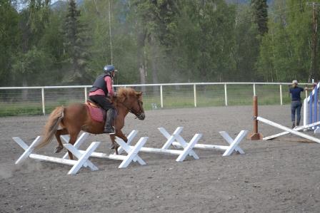 Rosey did very well going in a circle, as we did warm up exercises. And when asked, she walked, trotted, and cantered behind the other horses. We then were asked to follow the same horses over a small cavaletti, poles, and cross jumps. Rosey immediately became rushy, and several times moved up on Hunar’s ass. I asked, and Vickie told me to move my hands up onto her mane and by squeezing the reins, let her know that she was to put some distance between her and Hunar.