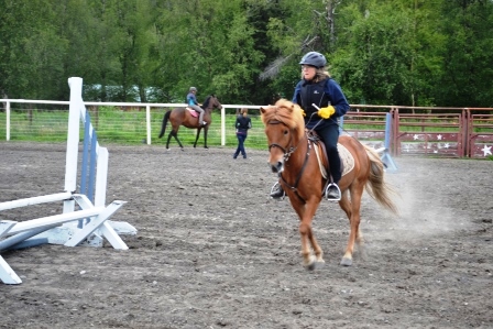Raudi was reluctant to leave her buddies at the far side of the arena. But she did it, and cleared the jump. Coming back, she put on the gas and cantered fast, taking the jump with room to spare. We did this three more times, in much the same fashion.