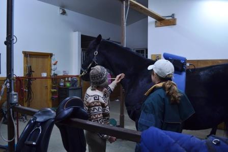 In the past (last winter), I stood behind the arena wall and watched Beth instruct those who are now my classmates. I could not hear her most of the time, so I usually left early. Last night was different. I was standing in the grooming area when Beth’s horse, Liam, who was in the wash area began acting up. Beth was at that time in the arena, instructing. She immediately came and got him, and continued to instruct while holding him. It reminded me of a woman with a child on her hip, trying to get her work done.