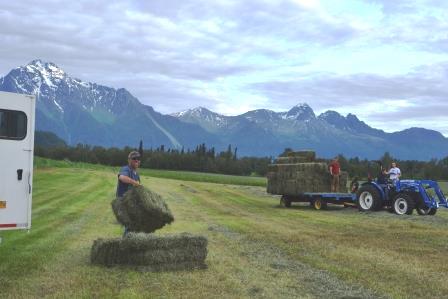 I took a break, went up to the house, and listened to phone messages. There was one. Our hay dealer called and said that he had quite a bit down on the ground, and to come and get it. Pete called back and said we were on our way. We hustled. So did everyone else. What a scene. There were at least a dozen other customers picking up hay off the field. They were piling it onto hay trailers, into pickups, and onto hay wagons. Ants never worked harder. And no wonder. The hay was lush, green, dry. And the price off the field was lower than it’s been in years.