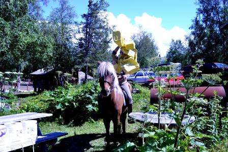 I ended up being a designated ground person – Pete did the same. The toughest obstacle was perhaps the most innocuous one, which was the tied together corn oil containers. (Even Tinni had a hard time with this.) The bright yellow containers were in a jumble, tied together with baling twine. Riders were to lift jugs off the picnic table, over their horses’ withers, and then set them down on a spool table. I helped the riders who were having difficulty with this. This included Dan and his horse Tinker, a Paso Fino. Tinker immediately made it clear that he wanted nothing to do with the containers—most likely he thought that the GMOs were going to eat him. I went and got an individual container, and first I repeatedly passed it (on both sides) to Dan. Then I had him pick up and set down the containers. Next, I had him lift the containers. And after that, he put the containers over his horses’ shoulder. I used treats – if Tinker had clicker training, I would have used my clicker.