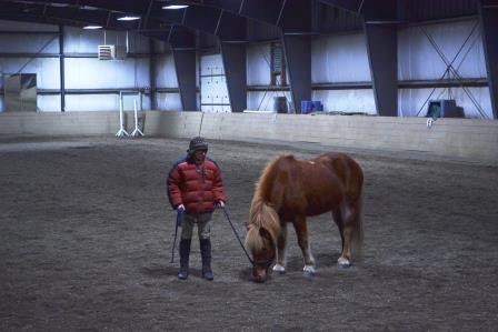 Beth had Emily, Cath and me first work on turning on the forehand. I’d had a difficult time in the past, doing this on her back. But this time I understood the directives and was able to carry them out. I was to have Raudi stand parallel to the arena wall, put my inside leg back behind her girth, my outside leg on her middle, tighten my inside rein, loosen my outside rein, and give her a nudge with my outside leg. Raudi did as asked, which was hold her front legs still and pivot on her rear legs to the opposite side of the wall. We began doing this, and trotting off the far side arena wall.
