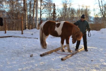 I didn’t put a halter on Raudi. Rather, I opened the gate and had her follow me out. Raudi of course knew that I had treats on hand because she saw me hand feed Hrimmi. She could also smell them on me. She went through the sawhorse bridge, stood on the plywood square, and walked around the traffic cones when asked. She also trotted over the ground poles and hopped over the cavalettis, with me running alongside. Brilliant horse.