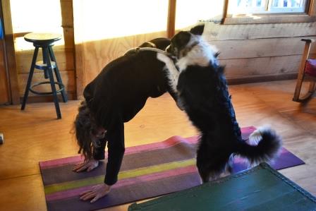 I think that our emulating canines is a very wise idea. However, there have to be boundaries; dogs need to know that there is a time and place for acceptable behavior, and that interrupting in-house yoga practice is an unacceptable behavior. Otherwise, the animals end up running the show.