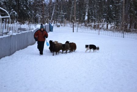 I later worked with Ryder but had a tough time because when the sheep stopped, she also stopped. (I think that they were reluctant to go into the deeper snow.) This can only be described as being a caprine log jam. Ryder finally got the sheep moving. (Pete later said that Ryder broke up the huddle by giving one sheep the eye. So once she moved, so did the rest.)