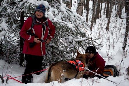 Search and rescue: Today I followed and listened to Stacey as she provided support to Cathy and her dog Tara. Tara, a German Shepherd, has had a year’s training as a trail dog. Trail dogs sniff a given object (today this object, a hat, was placed on the ground) and then follow the scent that the owner left behind. She must specifically locate the person and alert the handler to the subject’s whereabouts. The alert is specific to that particular dog. When being trained, the handler touches the subject, and after, the dog is rewarded with a treat, toy, copious praise, and an intense play session, which is prompted by the subject and the handler.