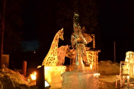 sculptures, statues – and small kiosks providing information about the sculptures and where they are from. (They hail from Mongolia, Russia, and Japan among other places). In addition to sculptures, there are ice slides and ice bowls for the kids to play in and for adults to venture into and onto. For kids, this is a never-to-be forgotten wonderland.