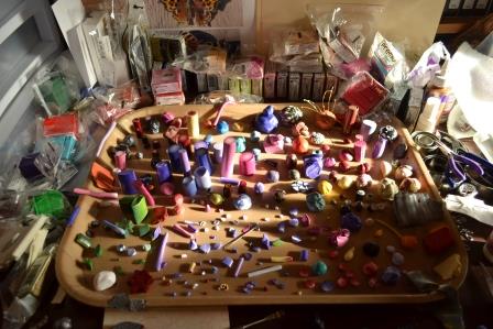 Sarah has been (as of late) working in polymer clay. The process of creating multi-colored earrings, necklaces, key chains, and the like is a very time consuming and exacting process. Sarah spent considerable time attempting to explain to me how she does this, and even gave me a demonstration. I still don’t fully understand the process, but it’s generally like this: she rolls and shapes the clay, then puts it through a pasta maker. She then makes rolls and combines rolls. Then she cuts the resultant slabs cross-wise. The resultant designs are quite beautiful.