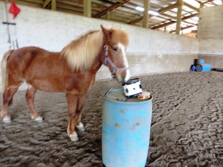 I dismounted, and Pam then produced Blessi’s musical instruments. These days, Pam is attempting to teach him to play the drums. I suspect that it won’t be long before he gets the hang of this, for he is a very smart fellow. We next moved on to pushing the barrel. (This was my idea). Blessi then taught me a valuable lesson, which is when working on this kind of thing, to take the horses’ interest into consideration. A case in point. Blessi wanted to push the barrel around, and I wanted him to push it straight forward. We met an impasse, and then called it good. What I later realized was that he was trying hard to tell me that his alternative plan was acceptable. He’d had these little furrows above his brow that I suspect mirrored his frustration. I vowed to someday make my inability to communicate up to him.