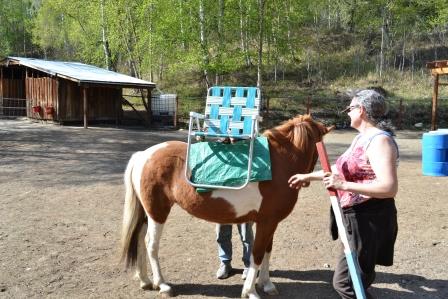 Working with Hrimmi was the most challenging – as June later said, she does know how to distract me. So we worked on her walking with me in unison, over a ground pole, and around the various obstacles that I’d previously set up. We did as Beth would do if her focus was on ground training, and we quit while we were ahead. And most importantly, we rewarded Hrimmi for a job well done. This was before putting a tarp and a lawn chair on her back, and wrapping her in caution flagging.