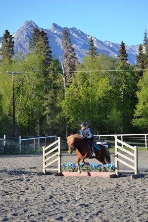 I obliged and aimed Raudi at the blue flower jump, at a trot. Upon coming closer, I loosened the reins, looked up, and squeezed my legs like the horse underneath me was a tube of toothpaste. Over the first jump she went, then over the second jump she went. I was of course disappointed that Beth wasn’t there on a night in which Raudi was clearly focused but oh well.
