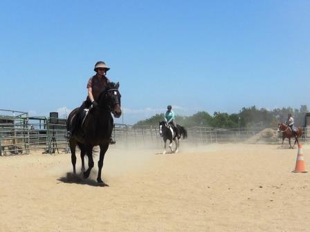 Elaine then told us to go out and practice what we’d just learned. Suddenly, horses and riders were everywhere. I gravitated in the direction of cones and poles, and worked Katina around and over these obstacles.