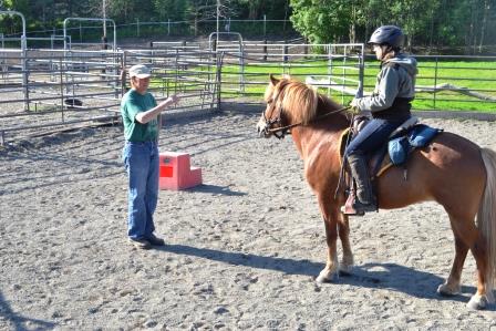 Sidepassing — Worked on the ground first, using Deb’s carrot stick. Raudi knew what to do, and when asked, did move both ways. Up against the fenceline – if horse is to move to the right – open right rein, open right leg – close left rein, close right leg. If horse is moving to the left – open left rein, open left leg, close right rein, close right leg.