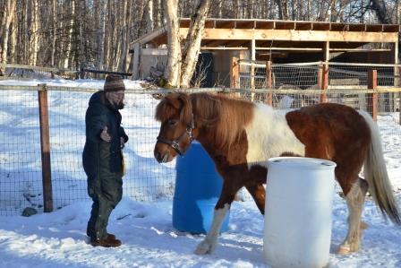H: Ruth’s horse Curly Sue pulls a cart. And her Shetland pony Diablo helps out. Ruth ties him to the side of the cart.