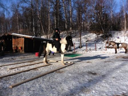 We wrapped up the day’ work by doing the whoa and ho game – Pete riding Tinni and ponying Hrimmi, Vicki riding Hunar and Dick riding Jokla. Whizbang Baboo wanted to haul ass, finally Dick had to get off and walk her. I realized that we should have called it good after the arena work. What he needs to realize is that Jokla’s progress has been incremental – but she is coming along.