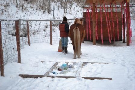 | I tied all three horses to the hitching post area – they ate quietly while we set up the course. It took us about 45 minutes. I then led the diva into the pen. The order of obstacles was tarp, corridor, pole, log, hula hoop, jump, flag corridor, streamers. Raudi and I then fumbled our way through the first few obstacles, and then got progressively better. I say “both” got better because we are a team. It can’t be any other way when you are doing something like this. I should also add that Pete is a part of this team.