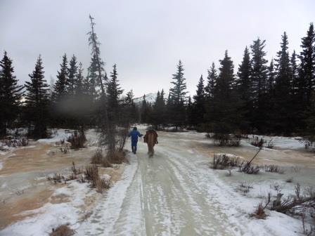 The question that I asked myself upon taking on this job was, how can I assist these individuals and their horses in becoming more adept, confident, and savvy trail riders? This was with the knowledge that Alaskan trail riders often face unique challenges, such as the somewhat rare grizzly bear encounter, and the altogether too common moose encounter. In the winter we share what I call the White Highway (packed snowmobile trails) with fat tire bicyclists and snowmachiners. Creaky branches, caused by high winds are the norm. Add to this summer conditions, i.e. fast flowing braided rivers and bogs. Oh yeah, and let’s not forget about having to deal with the ruts left by the four wheelers and swamp buggies.