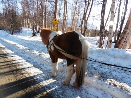 Today my good friends Michelle Coburn and Laura Croix came all the way in from Anchorage for a visit. Generally, people from the Valley go to Anchorage, but people from Anchorage do not come out here. They consider it too far away. Plus they think that there is not much to do here, the exception being around the holidays when they come in droves here and plunder the spruce trees – and then put them in their living rooms. Laura rode Tinni, Pete rode Raudi, and Michelle and I ground drove Hrimmi. Michelle handled the reins, and I walked with Hrimmi. The following is a condensed version of Hrimmi and my ongoing conversation.