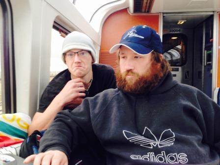 | I met Joe yesterday, in the late afternoon, when I ventured into the lounge car. He struck up a conversation with me. We were soon joined by Mitch. Mitch is 23, Joe (I think) in his mid-thirties. Mitch is wearing a gray cotton winter cap, Joe is wearing a ball cap with the words Cup Matches on it. Mitch is wearing a tee-shirt with the words Slip Knot on it – has head shots of some heavy metal band members. Joe is wearing an Adidas hoodie. Mitch has a lean face, has a smattering of facial hair and a slight case of acne, Joe has a round face, and a full round beard. He needs to trim his moustache.
