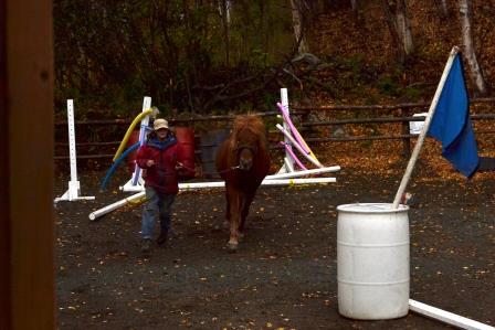 Late in the afternoon I resumed my horsey doings. I first did agility with Tyra. It was quite nice, having what I needed on hand. I tied a bag on the lunge whip so that she could chase it – this is the start of learning to do the panther walk. And I set out the gas can with the hay pellets in it – this was so she’d equate being in the playground with having a good time. I also added items to the scary corridor.