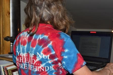 So I began my day by working at my bookcase desk. I then went out and tended to animals. I also assisted Pete in unloading hay. After, we came in for lunch. Rather than sit down, I remained standing. Later in the day we went to Alaska Home Companion where Pete worked the lights and I was an assistant stage manager. Nice title, but I did absolutely nothing but – stand there. By my estimates I would have been sitting down for three hours.