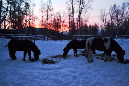 Kudos today, too, to Hrimmi. We put the harness on her and I drove her on the trails, behind Raudi. We had trouble with a few tight turns (my doing) but otherwise she moved right along, choosing on Siggi’s loop to be out front.