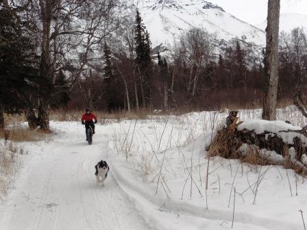 The first five minutes on Hestar were a little challenging. I had to internalize how the one set of derailleur levers work, and also figure out how to deal with soft snow patches. I figured out the derailleur levers really fast. As for the soft snow, this took me a little more time. What I discovered was that I’d stay upright if I maintained a fast cadence and rode through the patches hard. It was quite interesting because Pete, who was riding a thinner tired(!) mountain bike, patched out in the places that I floated through. This happened repeatedly.