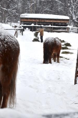Moments before he headed uphill with the snow-encrusted load, Pete handed me my gloves, which I had set at the base of Tinni’s stall. |