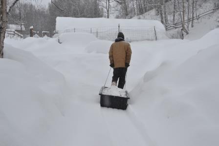 I continued to take photos while Pete dragged the sled around, and with shovel and rake in hand, picked up the manure. He did not get it all, because roughly half of it is buried under snow. This is an instance of semi-deferred maintenance. In the next few days it will stop snowing and what’s out there now will surface, adding more to the day’s haul.