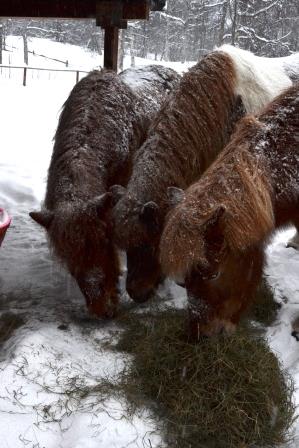 I was the first out the door – I went down to the horse pen with slurpy bucket in hand, opened the gate, and gave Tinni his mixture. He was most appreciative. He became even more appreciative when I gave him some hay. I then tossed the grrrrrrrrrrls some hay, right over the gate. Next, I picked up the camera and began taking photos. Pete appeared behind me, walked into the horse pen, and spread some of the hay out over the paddock. Raudi and Hrimmi continued to eat the hay that Pete left unattended, and Tyra, wise Tyra, ambled out into the open area and began eating the supposedly better stuff.