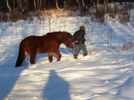 Pete had proposed that we go for a ride and open up our trails. I rode Raudi and he rode Hrimmi. It was a challenging ride for us all because the snow was (horse) chest deep in places. We walked on foot up the trail to Jim’s road. We then went around the loop – Pete ponied Ryder – and I worked with Raudi on transitions of various sorts.