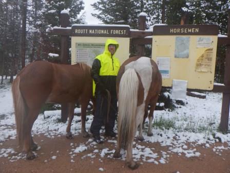 I woke up, finished reading an essay in the 1995 Best American Essays about Military Triage. Got up, and went for a brisk walk, so as to warm up. I noted that there wasn’t much forage for the horses by the road, but some springs of grass under the trees. This was going to have to do. I forced myself to bring to mind what I’d learned about hypothermia in the wilderness responder first aid course. Yes, our having walked the horses, eaten a warm breakfast, and returned to bed was a good idea. I was now cold, but not shivering. And it had been a good idea to stay where we were, for it was still raining/snowing.