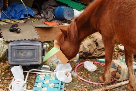 I noticed that they all are in excellent health. Their coats have a glossy sheen, and they all are of good weight. Most importantly, they have a kind and inquisitive look in their eyes. I next ventured down to the far end of the property, the animals ambling behind. I passed about 25 upended buckets, all of them containing horse manure. For the past two years, our good friend and fellow land steward Bill Schmidtkunz has been taking the full buckets and emptying them on an area close to the Matanuska River, this way creating a grassy strip. It’s now a lush, grassy area. If he had not been doing this, this land across from his house would be a parking area.