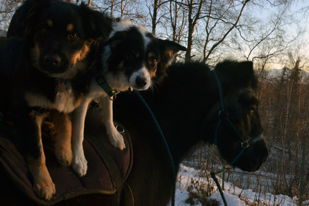 Sometimes, like today, I am slow to get going. The animals now provide me with a ready excuse to get out. And, they who also enjoy being on the move bring me great joy. Today, Shadow again rode Tinni. And Ryder came with when we got to the trails. The dogs bounded around and Tinni followed contentedly behind me. The temperature was in the teens, the sun was shining brightly. And, of course, I felt great joy.