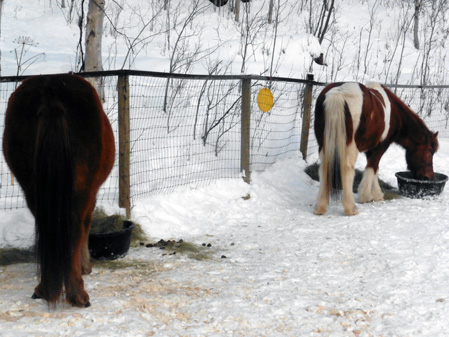 I am working with the ponies on targeting. Pete put three carabiners on three pieces of rope, which we attached to the supplement bucket lids. I attached the carabiners to the fence. Now the ponies, and particularly Raudi, are learning that this game has rules. You must go to your station and stand quietly and not mug me or your stablemates. If you do, you will not get a treat or a scratch on the neck. Way fun.