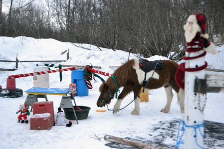 And I had to lift and carry the heavy poles that were on top of the barrels and embedded in the ice to the various obstacle sites. I also had to decorate the various obstacles. I must say, to my credit, I did pack the holiday decorations away neatly last year, so I had no trouble locating them this year. This included all the bottles in the bottle bank obstacle.