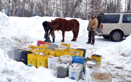 I first took Tinni and Raudi out, and then Tyra and Hrimmi. We went around the loop. I put boots with screws on the bottom on Raudi and Tyra. And I put grippers on my running shoes. The loop roads weren’t as bad as they were yesterday; in fact, Sybarite, the upper road, has melted out some.